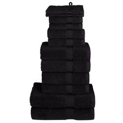 Cet ensemble de serviettes est idéal pour un usage domestique et commercial. Matériau super doux et de qualité supérieure : ces serviettes sont fabriquées à 100 % en coton filé à l'anneau, qui est doux, durable et résistant à la décoloration. Elles sont certifiées OEKO-TEX STANDARD 100 et testées pour les substances nocives, ce qui les rend dignes de confiance et fiables à utiliser.Absorbant : le tissu en coton doux rend ces serviettes de bain plus absorbantes. Elles absorbent plus d'eau pendant le nettoyage.Boucle de suspension pratique : ces serviettes sont livrées avec une boucle de suspension attachée pour chacun, ce qui facilite leur rangement sur des crochets ou des porte-serviettes.Lavable en machine : ces serviettes de visage en coton sont parfaitement adaptées à la machine et peuvent être facilement lavées avec de l'eau chaude et un peu de savon.Utilisation polyvalente : cet ensemble de serviettes de bain répond à différents besoins grâce à sa douceur et à sa durabilité. Ces serviettes sont polyvalentes et fiables pour les soins de beauté ou les tâches de nettoyage quotidiennes. Couleur : noirMatériau : 100 % cotonTaille du gant de toilette : 15 x 21 cm (l x L)Taille de l'essuie-mains : 30 x 30 cm (l x L)Taille de la serviette pour invités : 30 x 50 cm (l x L)Taille de la serviette à main : 50 x 100 cm (l x L)Taille de la serviette de douche : 70 x 140 cm (l x L)Qualité supérieure600 g/m²Certifié par STANDARD 100 par OEKO-TEXLavable en machineGamme : SOLUNDLa livraison contient :2 x gant de toilette2 x serviette de savon2 x serviette d'invité4 x essuie-mains2 x serviette de doucheCouleur : noirMatériau : 100 % cotonTaille du gant de toilette : 15 x 21 cm (l x L)Taille de l'essuie-mains : 30 x 30 cm (l x L)Taille de la serviette pour invités : 30 x 50 cm (l x L)Taille de la serviette à main : 50 x 100 cm (l x L)Taille de la serviette de douche : 70 x 140 cm (l x L)Qualité supérieure600 g/m²Certifié par STANDARD 100 par OEKO-TEXLavable en machineGamme : SOLUNDLa livraison contient :2 x gant de toilette2 x serviette de savon2 x serviette d'invité4 x essuie-mains2 x serviette de douche