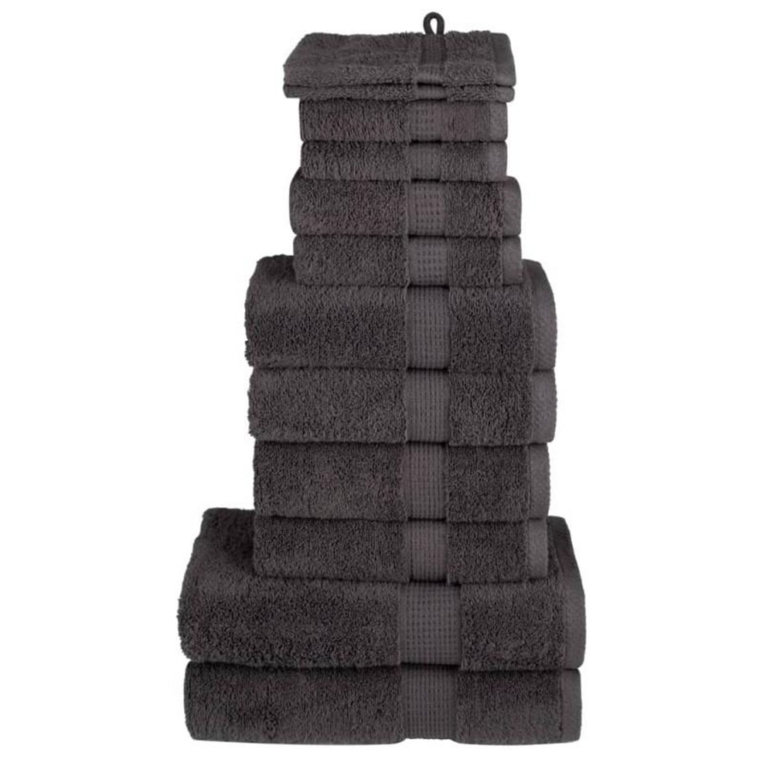 Cet ensemble de serviettes est idéal pour un usage domestique et commercial. Matériau super doux et de qualité supérieure : ces serviettes sont fabriquées à 100 % en coton filé à l'anneau, qui est doux, durable et résistant à la décoloration. Elles sont certifiées OEKO-TEX STANDARD 100 et testées pour les substances nocives, ce qui les rend dignes de confiance et fiables à utiliser.Absorbant : le tissu en coton doux rend ces serviettes de bain plus absorbantes. Elles absorbent plus d'eau pendant le nettoyage.Boucle de suspension pratique : ces serviettes sont livrées avec une boucle de suspension attachée pour chacun, ce qui facilite leur rangement sur des crochets ou des porte-serviettes.Lavable en machine : ces serviettes de visage en coton sont parfaitement adaptées à la machine et peuvent être facilement lavées avec de l'eau chaude et un peu de savon.Utilisation polyvalente : cet ensemble de serviettes de bain répond à différents besoins grâce à sa douceur et à sa durabilité. Ces serviettes sont polyvalentes et fiables pour les soins de beauté ou les tâches de nettoyage quotidiennes. Couleur : anthraciteMatériau : 100 % cotonTaille du gant de toilette : 15 x 21 cm (l x L)Taille de l'essuie-mains : 30 x 30 cm (l x L)Taille de la serviette pour invités : 30 x 50 cm (l x L)Taille de la serviette à main : 50 x 100 cm (l x L)Taille de la serviette de douche : 70 x 140 cm (l x L)Qualité supérieure600 g/m²Certifié par STANDARD 100 par OEKO-TEXLavable en machineGamme : SOLUNDLa livraison contient :2 x gant de toilette2 x serviette de savon2 x serviette d'invité4 x essuie-mains2 x serviette de doucheCouleur : anthraciteMatériau : 100 % cotonTaille du gant de toilette : 15 x 21 cm (l x L)Taille de l'essuie-mains : 30 x 30 cm (l x L)Taille de la serviette pour invités : 30 x 50 cm (l x L)Taille de la serviette à main : 50 x 100 cm (l x L)Taille de la serviette de douche : 70 x 140 cm (l x L)Qualité supérieure600 g/m²Certifié par STANDARD 100 par OEKO-TEXLavable en machineGamme : SOLUNDLa livraison contient :2 x gant de toilette2 x serviette de savon2 x serviette d'invité4 x essuie-mains2 x serviette de douche