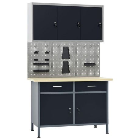 L'etabli robuste, se distingue par un grand espace de stockage et une capacite de chargement de 500 kg. Cet etabli possede 2 tiroirs, ce qui vous permet de bien organiser vos outils, pieces et accessoires tels que vis, clous et ruban adhesif. Les tiroirs sont equipes d'un mecanisme a roulement a billes pour un glissement en douceur. Il y a 2 etageres et un grand compartiment avec 2 portes verrouillables pour accueillir facilement les perceuses, les tambours de cable et les meuleuses. De plus, les pieds sont reglables en hauteur. Ce poste de travail est fabrique a partir d'acier et de bois d'ingenierie de premiere qualite, ce qui le rend tres robuste, durable et facile a nettoyer. C'est facile a assembler.