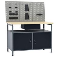 L'etabli robuste, se distingue par un grand espace de stockage et une capacite de chargement de 300 kg. Cet etabli possede un compartiment ouvert equipe d'un tiroir, vous permettant de bien organiser vos outils, pieces et accessoires tels que vis, clous et ruban adhesif. Il y a 2 etageres et un grand compartiment avec 2 portes verrouillables pour accueillir facilement les perceuses, les tambours de cable et les meuleuses. De plus, les pieds sont reglables en hauteur. Ce poste de travail est fabrique a partir d'acier et de panneaux de particules de premiere qualite, ce qui le rend tres robuste, durable et facile a nettoyer. C'est facile a assembler.