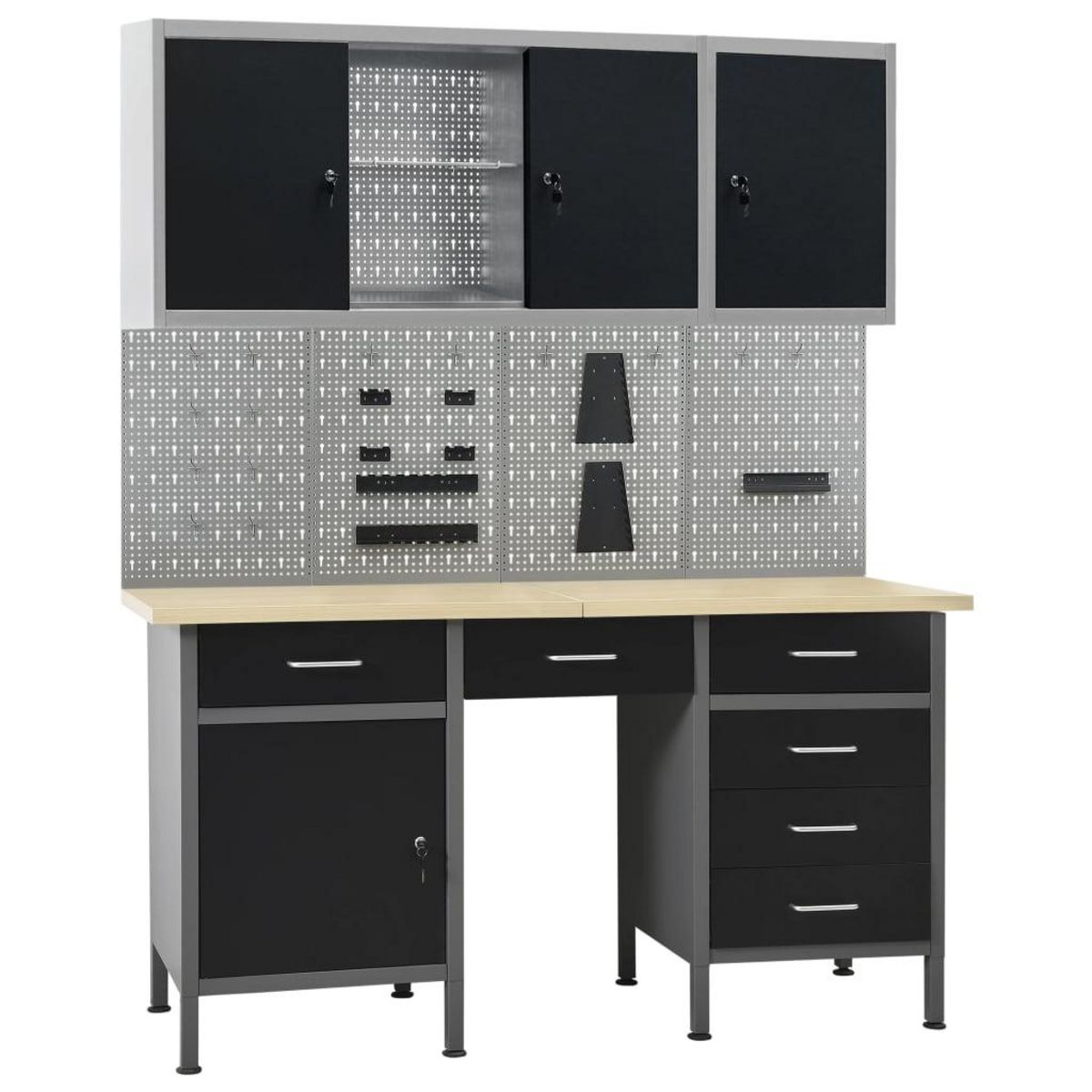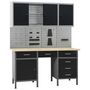Cet ensemble est combine avec 1 etabli, 4 panneaux muraux et 2 armoires murales, qui seront une solution de rangement pratique pour votre atelier et votre garage.
