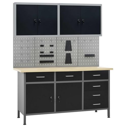 L'etabli robuste, se demarque par un grand espace de stockage et une capacite de chargement de 500 kg. Ce dessus de table grand et robuste offre une plate-forme stable pour tous vos travaux de reparation. L'etabli possede 6 tiroirs, ce qui vous permet de bien organiser vos outils, pieces et accessoires tels que vis, clous et ruban adhesif. Tous les tiroirs sont equipes d'un mecanisme a roulement a billes pour un glissement en douceur. Il y a 2 etageres et un grand compartiment avec 2 portes verrouillables pour accueillir les perceuses, les tambours de cable et les meuleuses. De plus, les pieds sont reglables en hauteur. Ce poste de travail est fabrique a partir d'acier et de bois d'ingenierie de premiere qualite, ce qui le rend tres robuste, durable et facile a nettoyer. C'est facile a assembler.