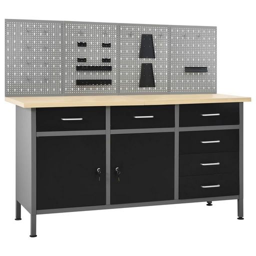 L'etabli robuste, se demarque par un grand espace de stockage et une capacite de chargement de 500 kg. Ce dessus de table grand et robuste offre une plate-forme stable pour tous vos travaux de reparation. L'etabli possede 6 tiroirs, ce qui vous permet de bien organiser vos outils, pieces et accessoires tels que vis, clous et ruban adhesif. Tous les tiroirs sont equipes d'un mecanisme a roulement a billes pour un glissement en douceur. Il y a 2 etageres et un grand compartiment avec 2 portes verrouillables pour accueillir les perceuses, les tambours de cable et les meuleuses. De plus, les pieds sont reglables en hauteur. Ce poste de travail est fabrique a partir d'acier et de bois d'ingenierie de premiere qualite, ce qui le rend tres robuste, durable et facile a nettoyer. C'est facile a assembler.