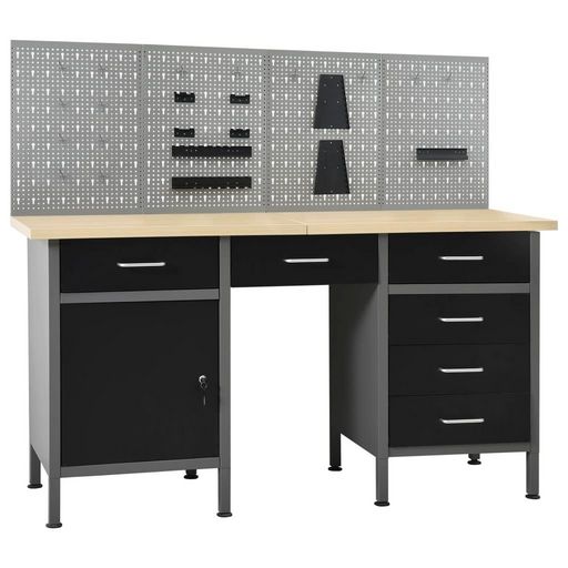 L'etabli robuste, se demarque par un grand espace de stockage et une capacite de chargement de 500 kg. Ce dessus de table grand et robuste offre une plate-forme stable pour tous vos travaux de reparation. L'etabli possede 6 tiroirs, ce qui vous permet de bien organiser vos outils, pieces et accessoires tels que vis, clous et ruban adhesif. Tous les tiroirs sont equipes d'un mecanisme a roulement a billes pour un glissement en douceur. Il y a 2 etageres avec 1 porte verrouillable pour accueillir facilement les perceuses, les tambours de cable et les meuleuses. De plus, les pieds sont reglables en hauteur. Ce poste de travail est fabrique a partir d'acier et de bois d'ingenierie de premiere qualite, ce qui le rend tres robuste, durable et facile a nettoyer. C'est facile a assembler.