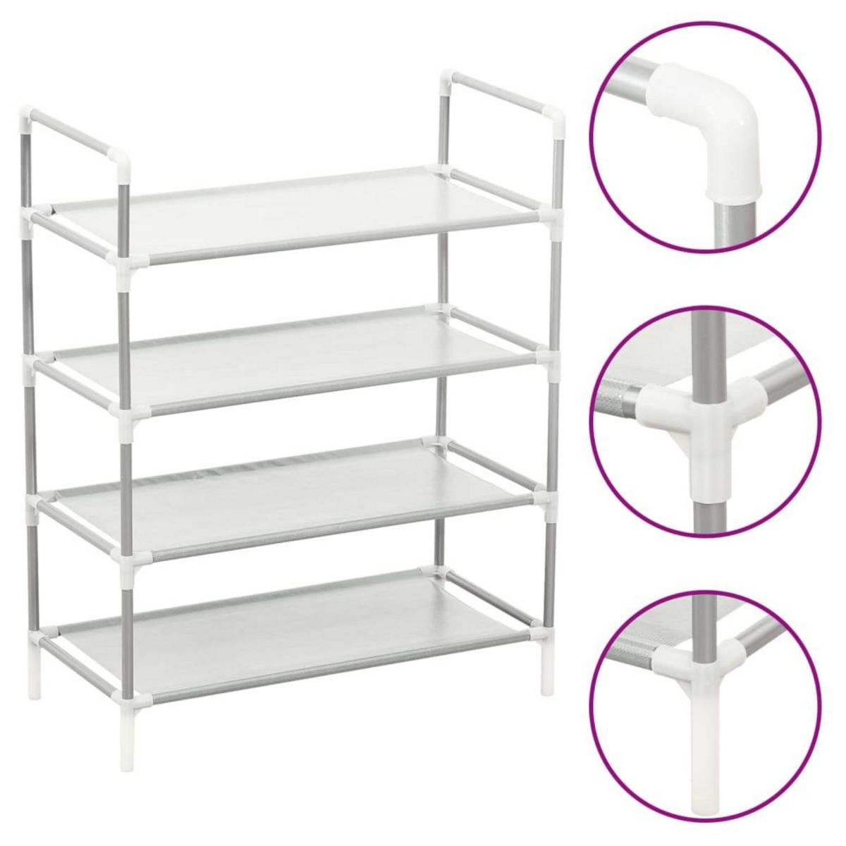 Elle a une structure tubulaire en metal, qui est legere mais robuste, ce qui rend l'etagere a chaussures facile a deplacer et assez stable. Elle dispose de quatre genereuses etageres en tissu intisse et offre suffisamment d'espace pour ranger vos chaussures et les mettre hors vue.