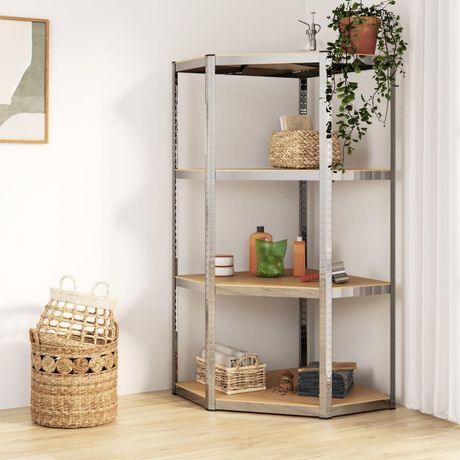 Etagere d'angle a 4 niveaux Argente Acier et bois d'ingenierie