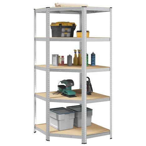 Etagere d'angle a 5 niveaux Argente Acier et bois d'ingenierie
