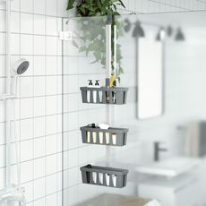 L'etagere de douche suspendue cree un espace de rangement pratique a l'interieur de la cabine de douche.