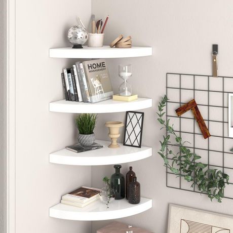 Cet ensemble de 4 etageres d'angle elegantes est ideal pour afficher vos livres preferes, decorations, photos, prix, etc.