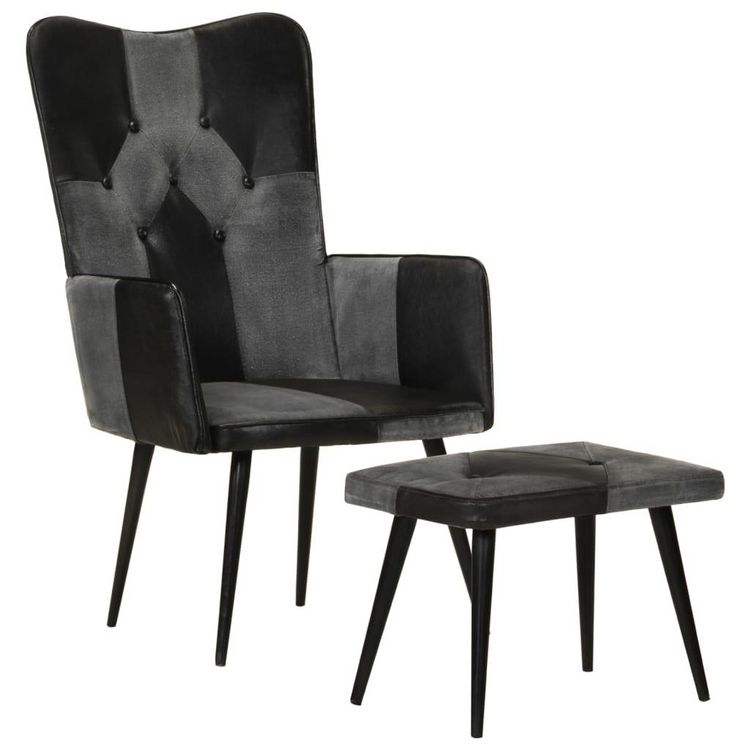 Fauteuil avec repose-pieds Noir Cuir veritable et toile