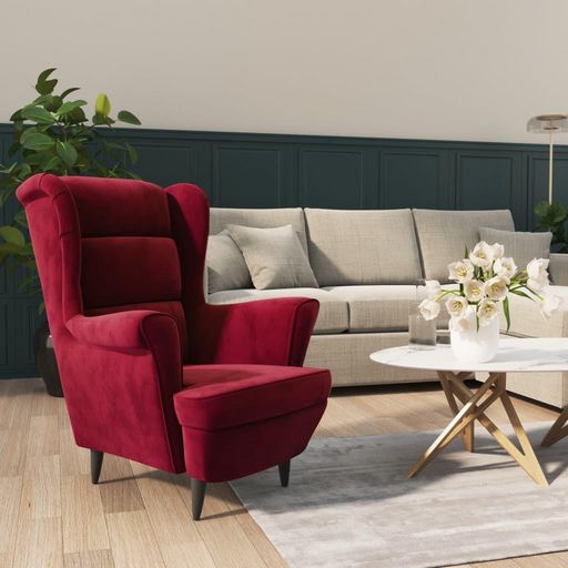 Le fauteuil est recouvert de velours, ce qui le rend doux au toucher et durable. Le cadre en contreplaque assure la stabilite. Le dossier et le siege rembourres offrent egalement une experience d'assise confortable.