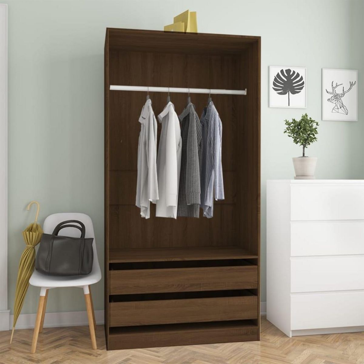 - Grand espace de rangement : l'armoire dispose de deux tiroirs et d'un grand compartiment avec une tringle, vous offrant suffisamment d'espace pour vos tenues plus longues et autres vetements et accessoires plies, tels que pulls, jeans, chapeaux, sacs a main, etc.