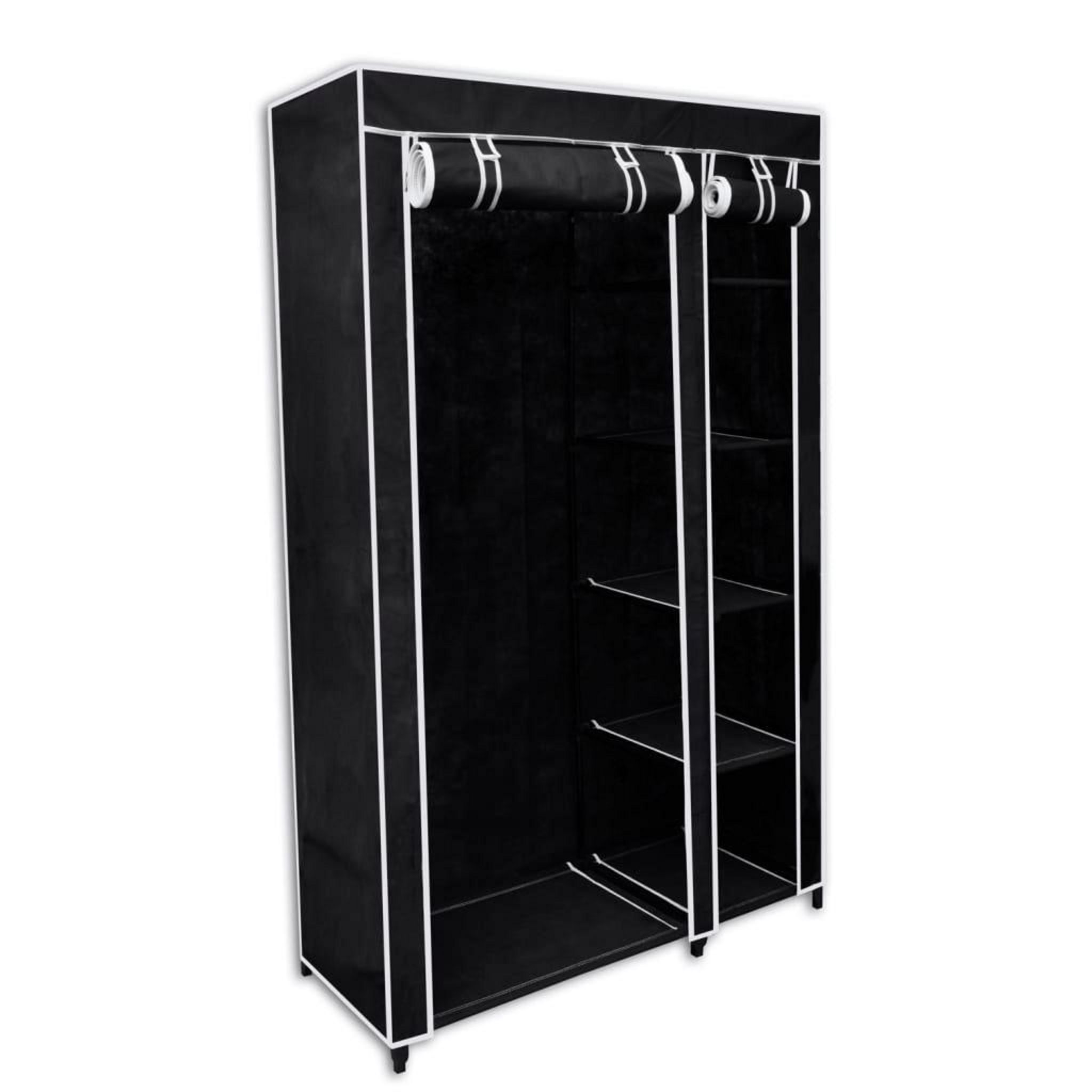 Vos vetements seront toujours tres bien conserves. Parce qu'elle est pliable, elle est peu encombrante et facile a assembler. La porte roulee est fixee a l'aide d'attaches a boucles et a crochets, qui protegent vos vetements de la poussiere et de la salete. Les fermetures a glissiere sont faciles a ouvrir et a fermer. La couverture de la garde-robe est en tissu polaire et la structure est en tubes d'acier.