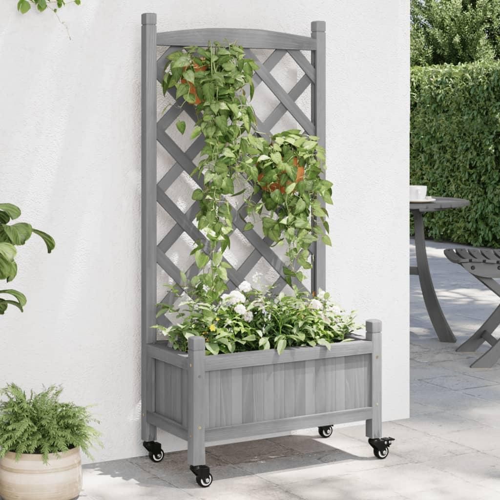 Jardiniere avec treillis et roues gris bois massif de sapin