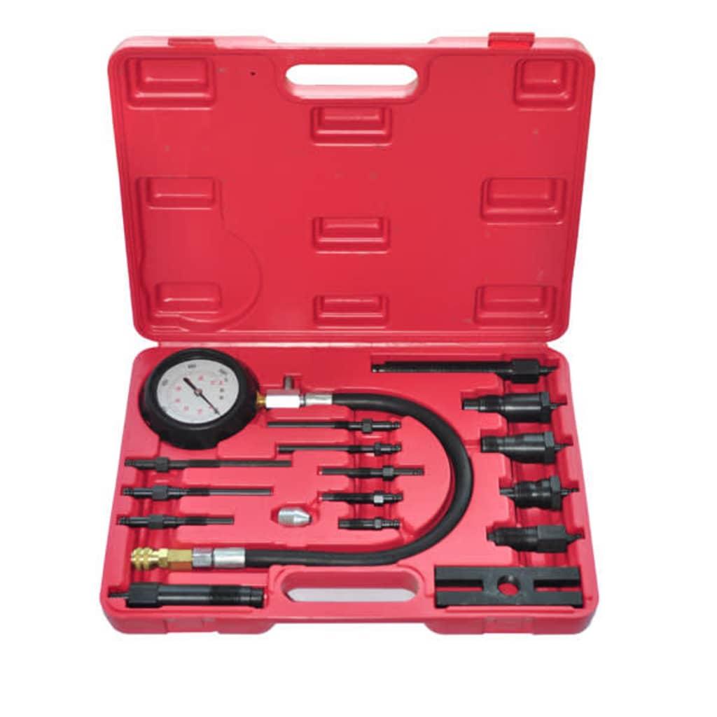Le manometre a une plage de mesure de 0 - 70 Bar / 0 - 1000 Psi. En plus du compteur de compression, vous pouvez obtenir 9 adaptateurs de filetage de bougie de prechauffage differents et 4 adaptateurs pour filets de buse. Le manometre a compression comprend egalement un dispositif de reinitialisation integre et tous les adaptateurs ont un raccourci.