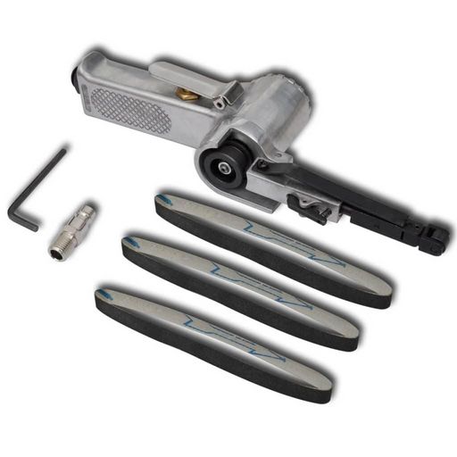 Notre lime pneumatique est livree avec 3 bandes (60, 80, 120 grains) qui peuvent etre echangees rapidement et sans outils. La tension de la bande est assuree par un galet tendeur ce qui vous garantit ainsi une securite maximale.