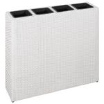Fabriquee en rotin resistant a l'eau, cette jardiniere sera un supplement parfait a votre espace exterieur. Sa structure de tissage serre produit une finition lisse et une excellente stabilite. Equipee de 4 contenants en plastique a l'interieur, cet ensemble de jardinieres assurera une longue duree d'utilisation. Toutes sortes de plantes et de fleurs vertes et animees peuvent etre bien placees dans les pots. La livraison inclut 1 jardiniere et 4 pots amovibles de meme taille.
