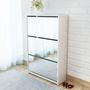 Ce meuble a chaussures moderne et elegant avec miroir offre une solution ideale pour eviter d'encombrer votre piece avec des chaussures. Ce meuble a chaussures avec miroir possede trois tiroirs inclines qui peuvent accueillir jusqu'a 3 ou 4 paires de chaussures chacun. Le meuble est fixe directement