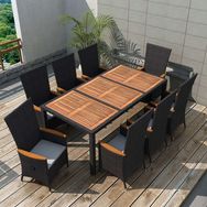 Cet ensemble a dîner en rotin au design elegant et contemporain sera un excellent choix pour manger en plein air ou vous detendre dans le jardin. Fait de rotin PE resistant aux intemperies et a l'eau, l'ensemble a dîner est facile a nettoyer, resistant et adapte pour une utilisation quotidienne. Les cadres en acier laque rendent la table et les chaises solides et robustes. Le dessus de table et les accoudoirs sont fabriques en bois d'acacia, un bois dur tropical, qui est resistant aux intemperies. 2 des 8 chaises sont des chaises inclinables grace au dossier reglable. En touchant le bouton sur le cote, le dossier s'inclinera. Grace a leur construction legere, tous les elements sont faciles a deplacer.