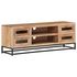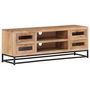 Ce meuble stereo est fabrique en bois d'acacia massif, ce qui le rend robuste et stable. Le savoir-faire artisanal et les beaux grains du bois rendent chaque meuble unique et legerement different l'un de l'autre. Le meuble hi-fi est equipe de 4 tiroirs et de 2 etageres, afin que vous puissiez afficher ou garder tous les articles que vous souhaitez bien organises. De plus, la base en acier ajoute a sa robustesse.