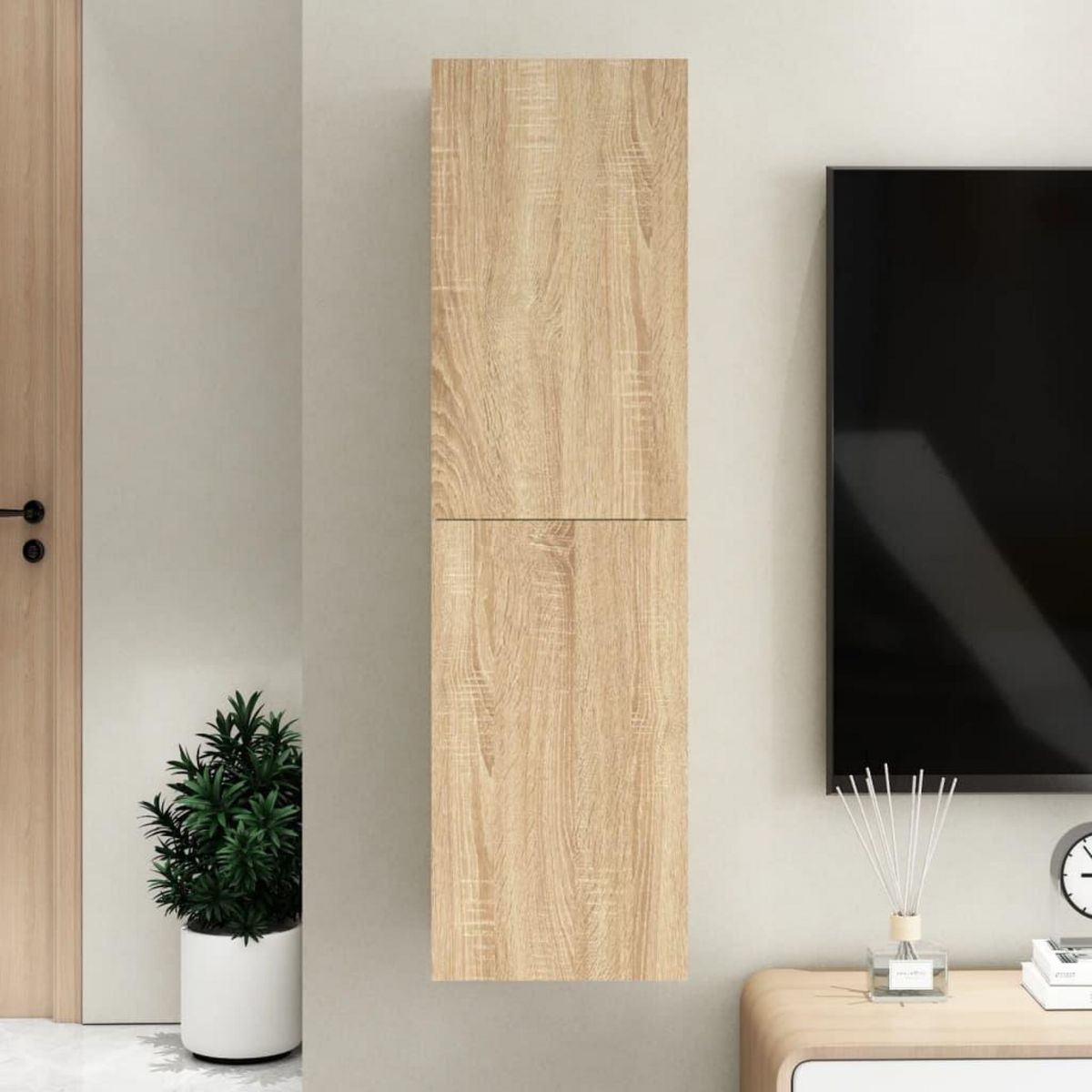 Cette armoire TV murale est en bois d'ingenierie, ce qui la rend robuste et stable. L'armoire dispose de 2 etageres, ce qui en fait un endroit ideal pour ranger tous vos livres, magazines, DVD ou autres objets. L'armoire murale est egalement facile a nettoyer avec un chiffon humide.