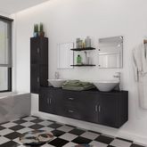 Cet ensemble complet comprend 1 armoire de lavabo murale, 2 armoires murales, 2 miroirs, 2 etageres et 2 lavabos et complete parfaitement votre salle de bain en optimisant votre espace sans compromettre le style.