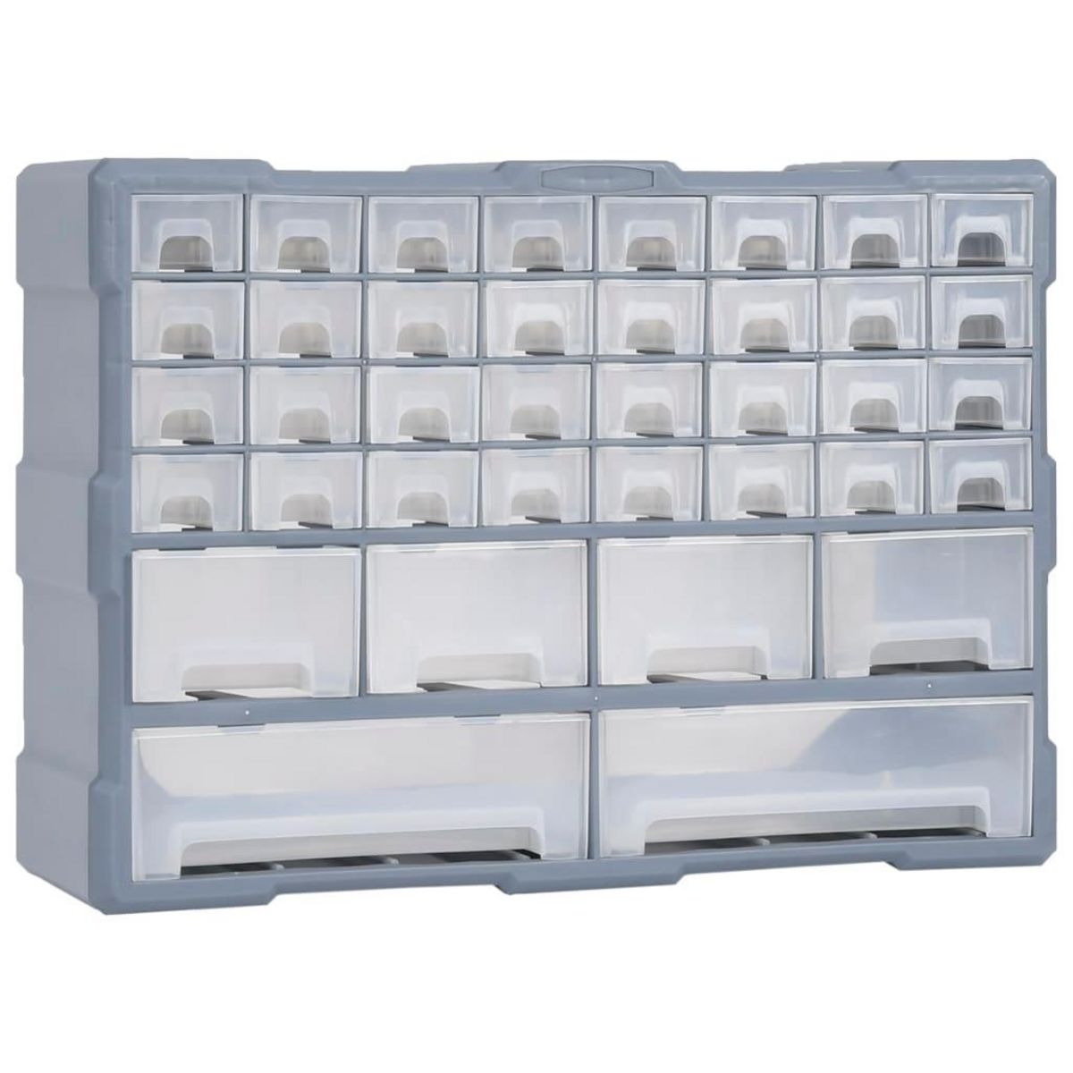 Ce meuble de rangement contient 32 petits tiroirs, 4 tiroirs de taille moyenne et 2 grands tiroirs pour repondre a vos differents besoins. Il garde vos outils a main et accessoires comme les fixations organises et a portee de main. L'armoire a outils est fabriquee en plastique resistant aux chocs, qui est a la fois durable et stable. Les tiroirs sont en plastique transparent afin que vous puissiez identifier rapidement le contenu. Cette boîte de bricolage est ideale pour ranger les ecrous, les boulons, les vis, les clous, les fixations generales et les composants.