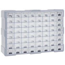 Ce meuble de rangement contient 64 petits tiroirs, qui garde vos outils a main et accessoires comme les fixations organises et a portee de main. L'armoire a outils est fabriquee en plastique resistant aux chocs, qui est a la fois durable et stable. Les tiroirs sont en plastique transparent afin que vous puissiez identifier rapidement le contenu. Cette boîte de bricolage est ideale pour ranger les ecrous, les boulons, les vis, les clous, les fixations generales et les composants.