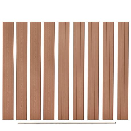 Ces panneaux WPC ont une impression de grain de bois sur un cote et une impression reguliere sur l'autre, ce qui vous permet de choisir le motif qui vous convient le mieux. Nos panneaux en composite bois-plastique ne necessitent aucun traitement supplementaire, tel que de l'huile ou de la peinture. Ils sont tres durables et resistants a la pourriture ou a la rouille. Grace au profil superieur en aluminium, les panneaux peuvent etre etroitement lies les uns aux autres, ce qui augmente leur rigidite et leur resistance aux chocs. Conçus avec le systeme modulaire, les panneaux de cloture vous permettent d'etendre librement la cloture. La livraison comprend 9 panneaux en WPC et 1 barre finale d'aluminium.