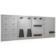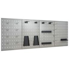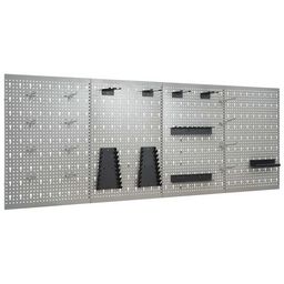 Ces panneaux a outils sont fabriques en acier massif pour supporter le poids de divers outils, comme les perceuses, les pinces, les tournevis et les cles. Les panneaux sont perfores pour fixer les outils facilement et en toute securite. Les 4 panneaux muraux peuvent etre fixes ensemble pour plus de rigidite. C'est un complement ideal a votre etabli et a vos armoires d'atelier avec une largeur pratique de 160 cm.