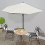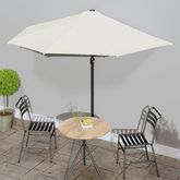 Fabriquee en polyester anti-UV et anti-decoloration, la couverture de parasol vous offre une protection optimale contre le soleil et est facile a nettoyer. Avec un diametre de mat de 38 mm, il pourrait etre monte sur le support ou au milieu de tables avec trou. Sa forme demi-ronde ajoute egalement au charme unique du parasol. Le mat en aluminium resistant, ainsi que les 5 nervures en acier robustes, rendent le parasol tres stable et durable. Le parasol de jardin peut etre facilement ouvert et ferme grace au mecanisme a manivelle. L'article est facile a assembler.