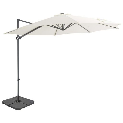 La base de parasol supplementaire est constitue de 4 parties separees et peut etre remplie avec 60 litres d'eau ou 80 kg de sable. Elle est ideale pour stabiliser les parasols a base transversale. La base du parasol a un poids leger, ce qui le rend facile a transporter.