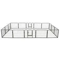 Ce chenil pour chiens peut etre facilement mis en place ou demonte. Il se compose de 16 panneaux robustes et chaque panneau peut etre facilement attache au suivant, ce qui vous permet de configurer le parc en differentes formes. L'enclos pour chiens comprend deux portes a charniere avec loquets de securite pour un acces facile. Ce parc pour chiens, durable et resistant aux intemperies, est en acier antirouille enduit de poudre, ce qui le rend ideal pour une utilisation a l'exterieur et a l'interieur. Les piquets de sol inclus aident a maintenir le parc d'exterieur en place pour plus de stabilite et de securite.