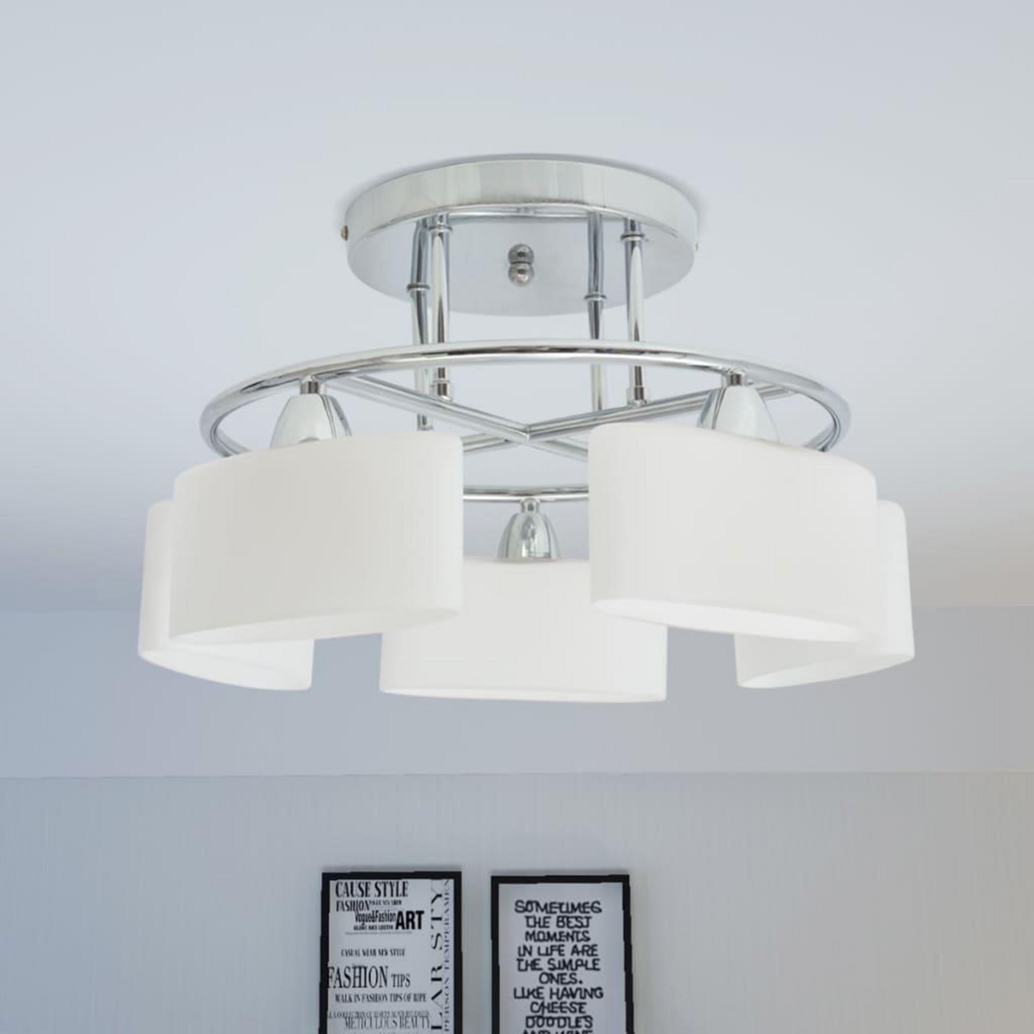 Ce plafonnier unique, avec cinq globes en verre, presentant un design moderne, repondra a tout decor de salon ou de chambre a coucher. Cette lampe peut etre facilement montee sur n'importe quel plafond grace a sa base en metal de haute qualite. Une lumiere agreable passera a travers ces globes ellip