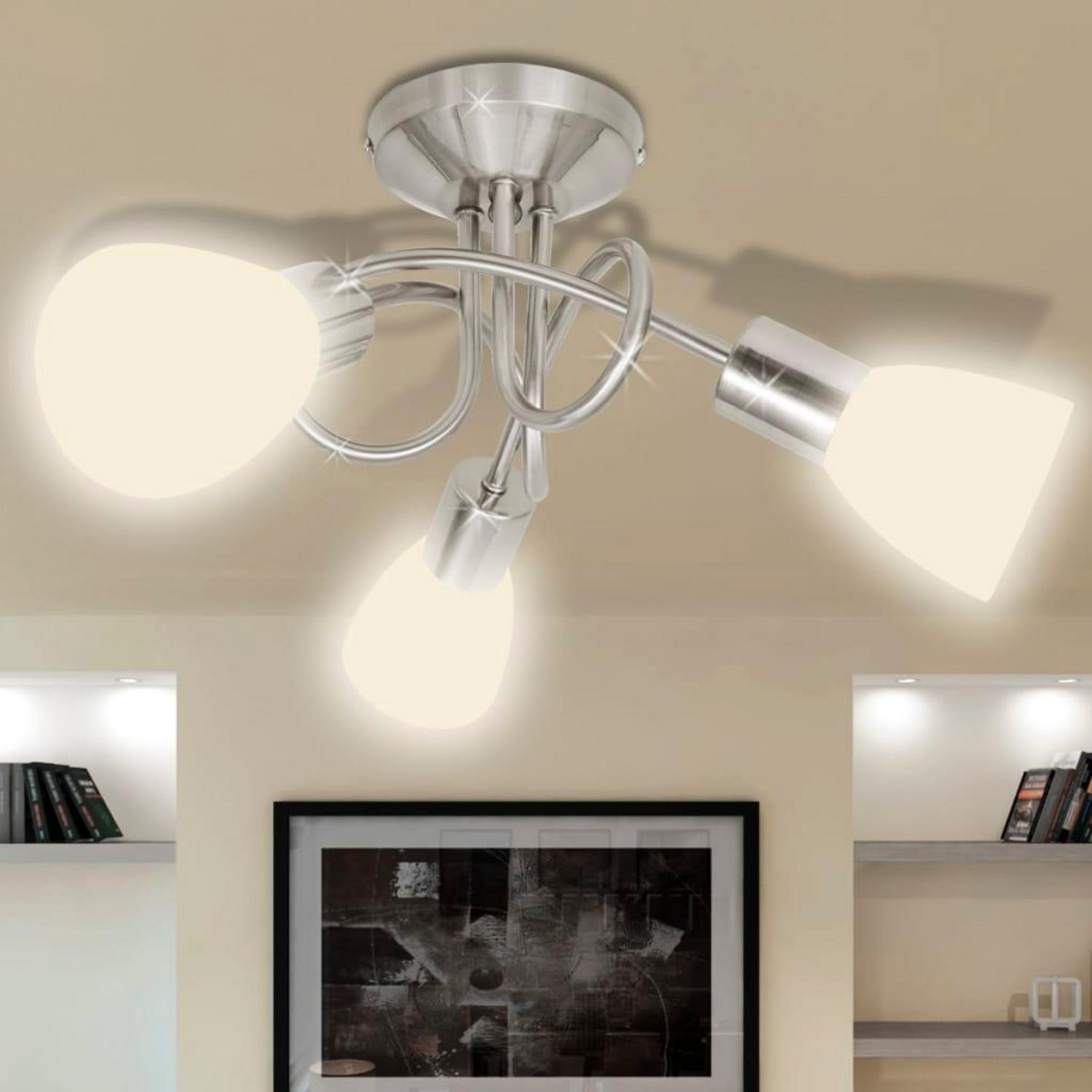 En savoir +Ce plafonnier unique, avec trois abat-jour en verre, presente un design moderne. La finition en nickel satine donne a cette lampe un style contemporain - parfaite pour le salon ou la chambre a coucher de tout style.