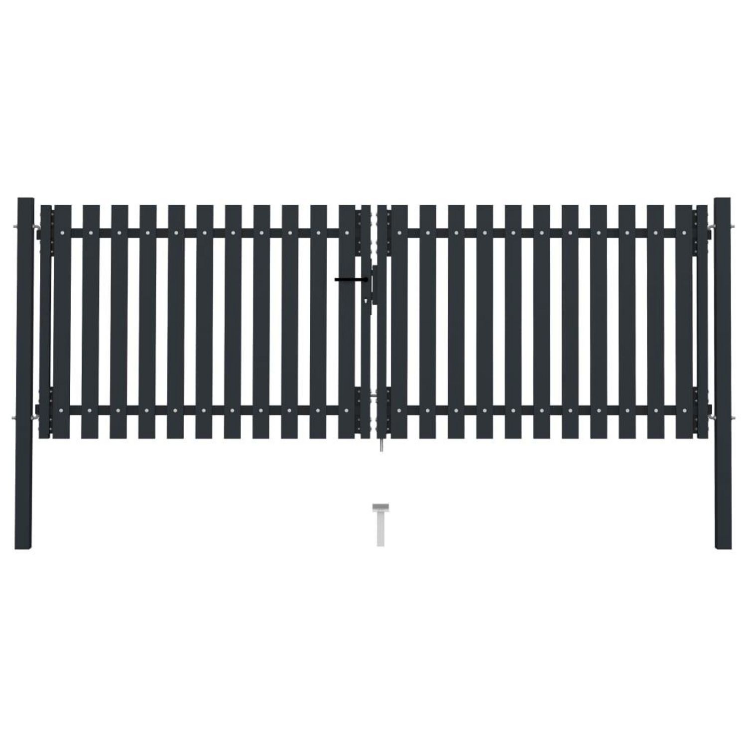 Ce portail a double porte offre une entree de style contemporain pour dissimuler votre jardin du monde exterieur. Ce portail est fait d'acier enduit de poudre, ce qui le rend extremement solide. Ce portail de jardin, avec une serrure, une poignee et une goupille de terre, offre un haut degre de secu