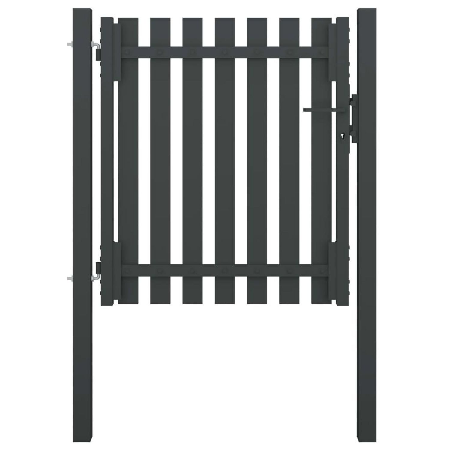Grace a son cadre en tube plat renforce, notre portail de jardin offre un haut degre de securite, tout en formant une entree fabuleuse sur votre propriete. La porte est fabriquee en acier robuste et est enduite de poudre contre la rouille et la corrosion. Ce portail de cloture est equipe d'un systeme de verrouillage et est livre avec deux poteaux solides comprenant des charnieres robustes pour une installation facile.