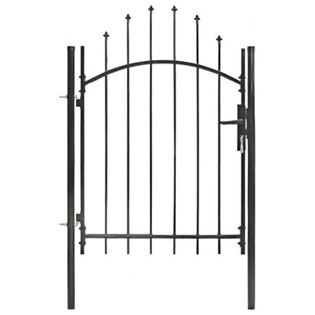 Grace a son design elegant et au dessus arque et a ses renforts horizontaux resistants pour renforcer le cadre, notre portail de jardin fournira un haut degre de securite tout en constituant une fabuleuse entree sur votre propriete. Fabriquee en acier robuste, la porte est revetue de poudre contre la rouille et la corrosion. Cette porte de cloture est equipee d'un systeme de verrouillage et est livree avec deux poteaux solides le long des charnieres robustes pour une installation facile.