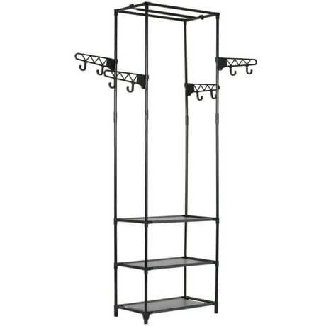 En savoir +Ce porte-vêtements minimaliste constitue une solution de rangement idéale pour la chambre à coucher ou la salle de bain. Sa structure en acier tubulaire à revêtement par poudre est légère mais robuste, ce qui rend le porte-vêtements facile à déplacer et assez durable. Il est doté de trois étagères fabriquées dans un tissu non tissé et conçu pour garder vos sacs, chaussures ou petits objets à portée de main. Il a également quatre bras latéraux avec des crochets pour un espace de stockage supplémentaire pour vos vêtements plus longs, comme les manteaux et les vestes. L'assemblage est facile.