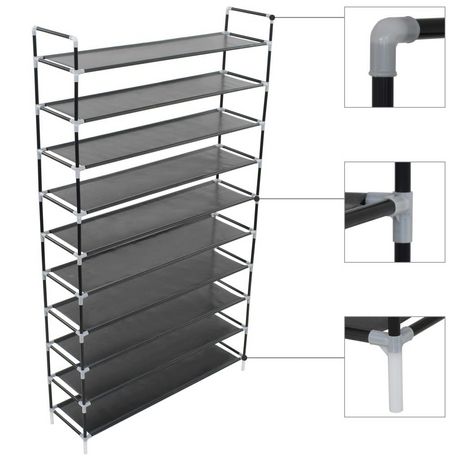 Il a une structure tubulaire en metal, qui est legere mais robuste, ce qui rend le support a chaussures facile a deplacer et assez durable. Il dispose de dix genereuses etageres en tissu non tisse et offre suffisamment d'espace pour ranger vos chaussures et les mettre hors vue.