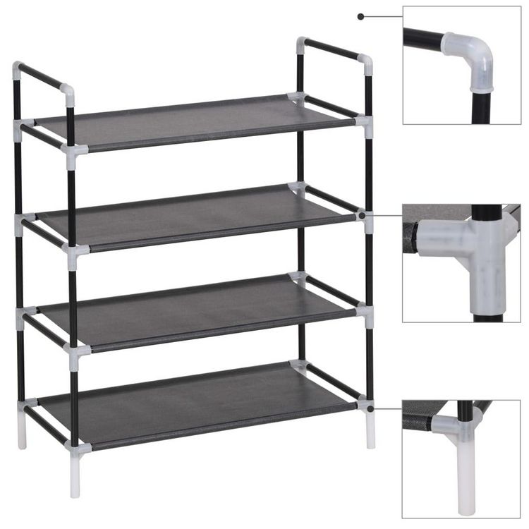Il a une structure tubulaire en metal, qui est legere mais robuste, ce qui rend le support a chaussures facile a deplacer et assez durable. Il dispose de quatre genereuses etageres en tissu non tisse et offre suffisamment d'espace pour ranger vos chaussures et les mettre hors vue.