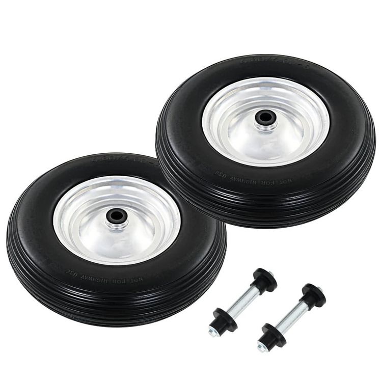 Les pneus pleins sont fabriques en elastomere PU resistant a l'abrasion et presentent une conception de bande de roulement speciale qui offre une adherence accrue a grande vitesse. Les jantes sont en metal robuste. Les roues de rechange ont une taille universelle et peuvent etre facilement installees sur vos brouettes, diables, chariots, etc.