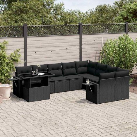 Salon de jardin 10 pcs avec coussins noir resine tressee