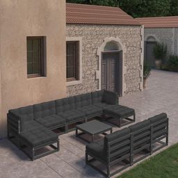 Salon de jardin 11 pcs avec coussins Noir Bois de pin massif