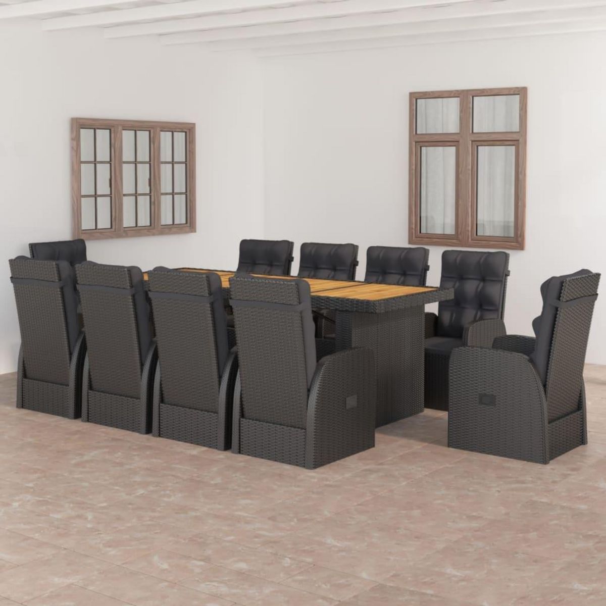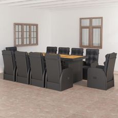 Cet ensemble de meubles de jardin est dote d'un cadre robuste en acier enduit de poudre, tres stable et durable. La resine tressee rend cet ensemble de salle a manger facile a nettoyer, resistant a l'usure et adapte a une utilisation a l'exterieur. Le dessus de table est en bois d'acacia massif, un bois dur tropical, resistant aux intemperies et durable. Les chaises inclinables offrent le plus grand confort d'assise et un excellent soutien. Le dossier est facilement reglable selon votre desir en utilisant le bouton au cote. Les chaises avec repose-pied apportent egalement un confort supplementaire. De plus, les coussins d'assise et de dossier epais et moelleux sont egalement tres confortables.