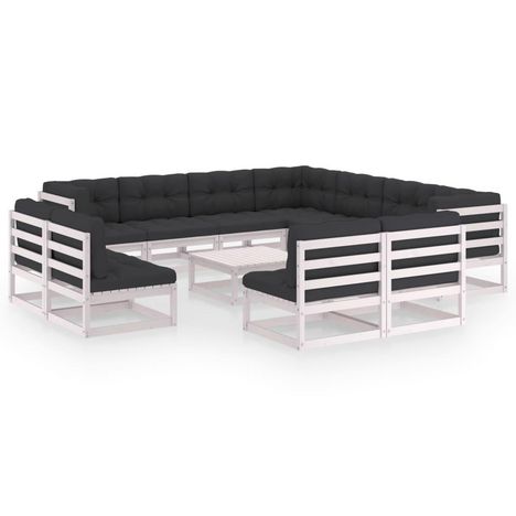 Salon de jardin 12 pcs avec coussins Blanc Bois de pin massif