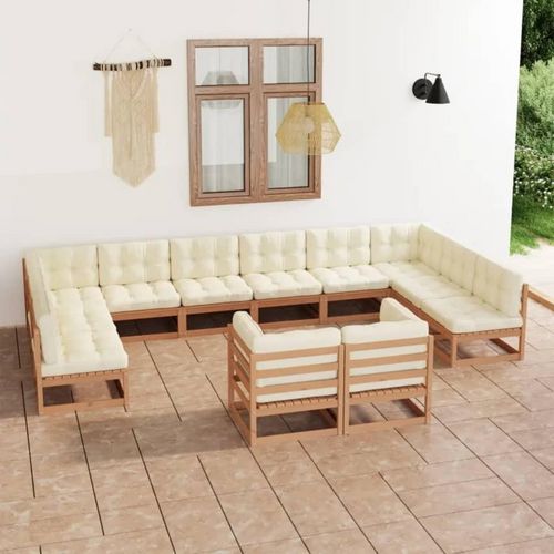 Salon de jardin 12 pcs avec coussins marron miel bois de pin