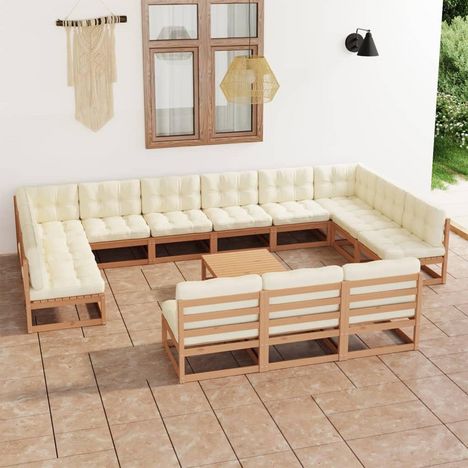 Salon de jardin 14 pcs avec coussins Marron miel Bois de pin