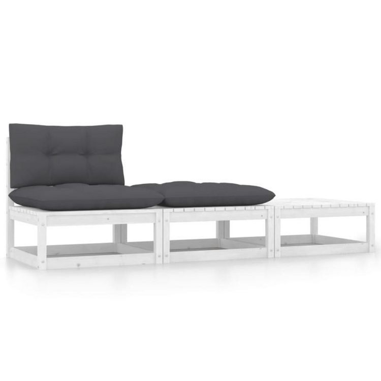 Salon de jardin 3 pcs avec coussins Blanc Bois de pin massif