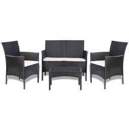 Cet ensemble de canapes en resine tressee, compose d'un canape a deux places, de 2 fauteuils, d'une table basse et de 3 coussins de siege, vous offrira un coin salon elegant pour votre jardin ou patio.
